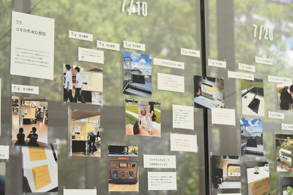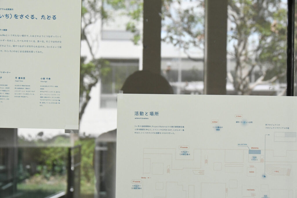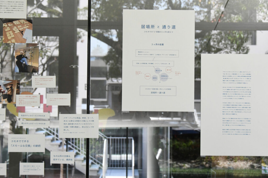 展示では、プロジェクトの始まりから終わりまでのプロセスを、「活動」「繋がり」「気付き」の3つの視点と写真で振り返り、できたばかりのCommon Nexusという場の「市(いち)」としての可能性についても言及している。